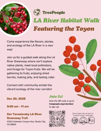 Join us for a guided walk along the LA River Greenway, where we’ll explore native plants, meet pollinators, and forage for Toyon fruits. We will be gathering its fruits, enjoying dried berries, making jelly, and tasting cider.