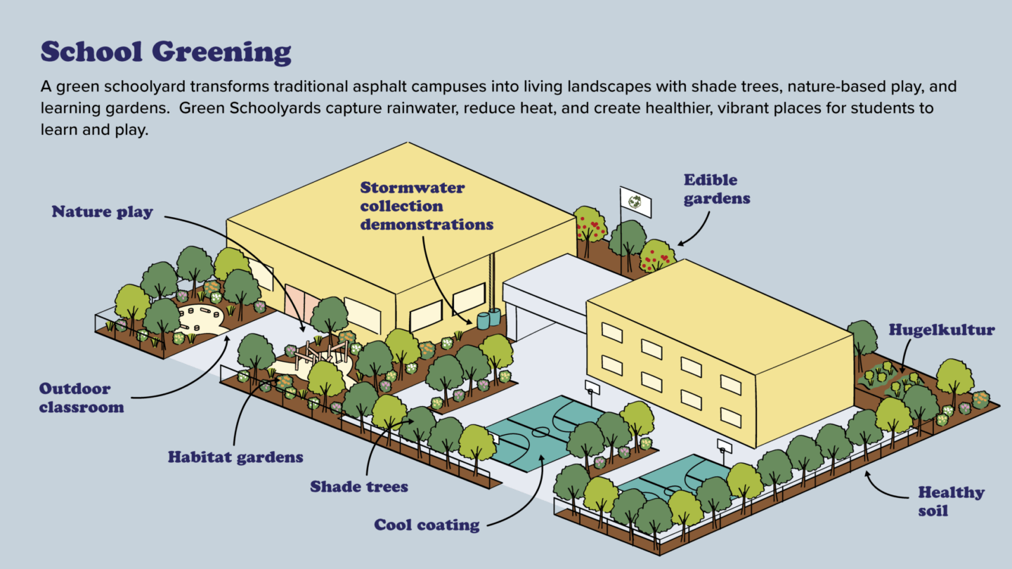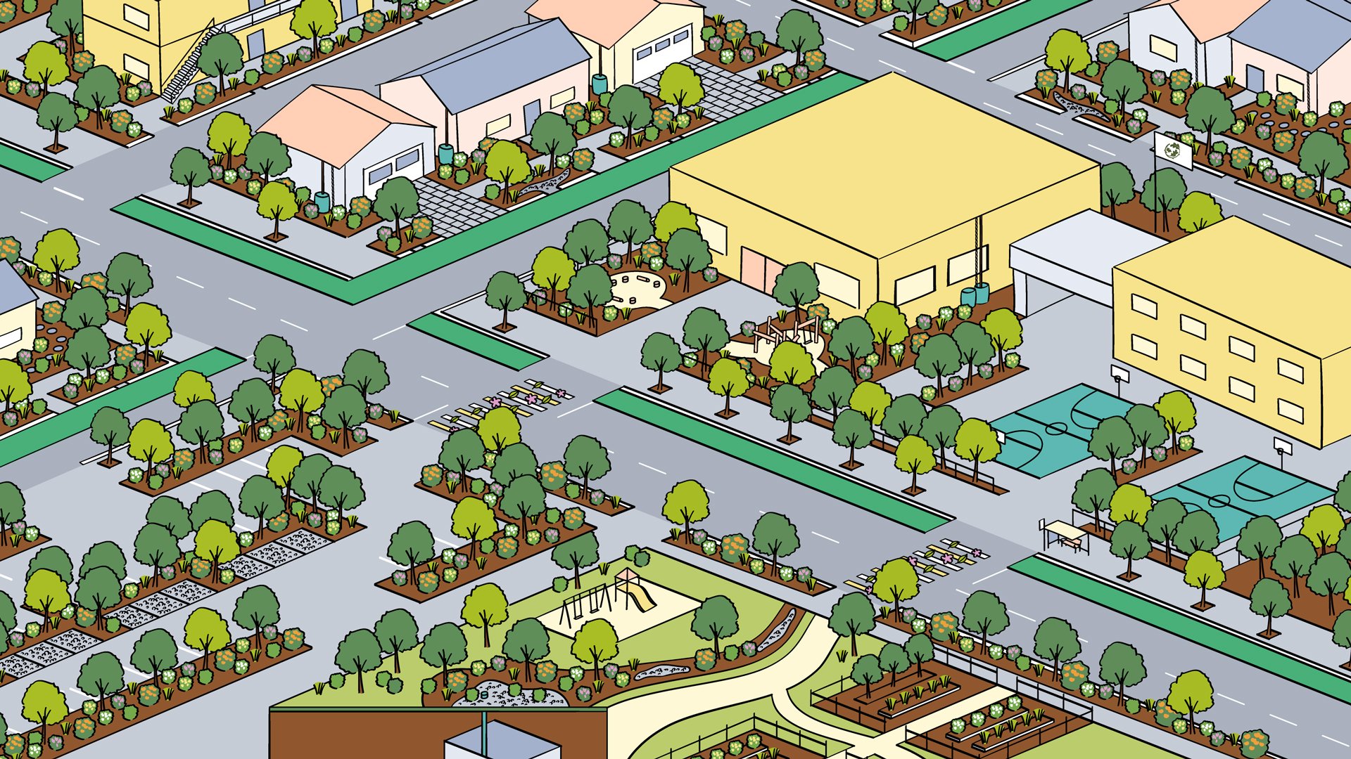 TreePeople’s Green Infrastructure program partners with communities to transform our urban landscapes into greener, healthier spaces. We work across schools, parks and public spaces, private parcels and streets, and turn lawns and paved areas into thriving landscapes. Our team designs, implements, maintains and advocates for green infrastructure projects that help capture water, reduce heat, and improve community well-being.