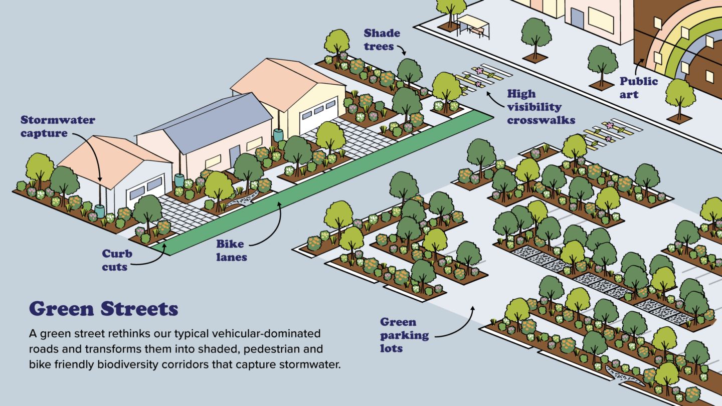 - Bioretention swales and curb extensions to naturally filter stormwater