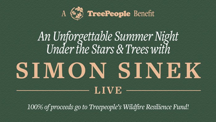 Simon Sinek Live On Thursday, August 7, spend a magical summer night with best-selling author and visionary thinker Simon Sinek as he explores how friendship, connection, and purpose can drive lasting change in our communities and the environment. This special event supports TreePeople’s mission to restore wildfire-scarred landscapes and build climate resilience across Southern California. Experience it in-person under the stars or stream it live from wherever you are! Either way, you’ll be part of one unforgettable evening. Buy in-person or livestream tickets here! |